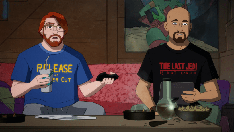 Harley Quinn episode 5 starts out on a meta joke: A neckbearded nerd goes on a rant about the Harley Quinn show and Harley’s “Mary Sue powers” while calling The Joker a cuck and complaining about SJWs. His friend notes that the guy has in-depth knowledge of the show and has actually written reviews of individual episodes despite claiming to have never seen it because he isn’t “a twelve year old girl.” Noticing that the episode is focused on Bruce Wayne with no appearances by Quinn or Ivy, he concedes interest.