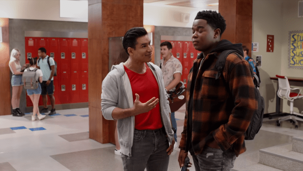 Saved By The Bell follows Daisy (Haskiri Velazquez), Aisha (Alycia Pascual-Peña) and Devante (Dexter Darden) as they navigate Bayside High and its privileged world. Daisy’s job is to look at the camera and with a “can you believe this bitch” expression whenever the white characters say something stupid. Her other job is to sideline the show’s attempts at going back to the old sitcom structure. Aisha is a competition-focused strong young black girl who powers her way onto the football team while Devante who the first episode partially sets up to be a football player joins the drama club.