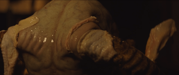 It’s all good fun. I’d also like to highlight this scene of the monster that I snapshotted where you can clearly see that his costume is partially made up of of chicken cutlet skin. As a fan of low budget campy horror, this boosted my score by a full grade.