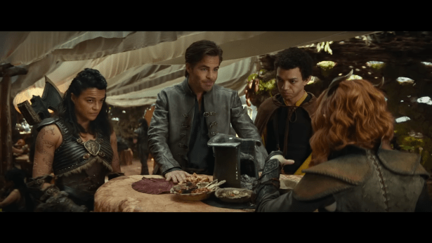 The movie stars Chris Pine as Edgin Darvis, a bard really working overtime to improve my perception of Chris Pine. Darvis is a bard who after the untimely murder of his wife breaks out of prison to try to find his daughter Kira (Chloe Coleman) who has been living with con artist Forge Fitzwilliam (Hugh Grant). After learning that Forge still possesses the Tablet of Reawakening, he sets out on a mission with tiefling druid Doric (Sophia Lillis) and sorcerer Simon Aumar (Justice Smith) to break into the vault and steal it back to resurrect his dead wife.
