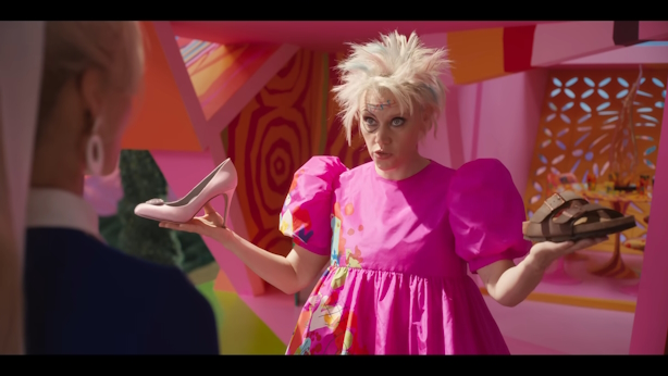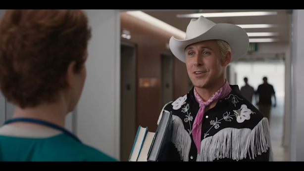By which I mean Barbie starts feeling existential dread and her heels drop. Barbie meets with Weird Barbie, played by Kate McKinnon, who explains that her changes are due to the real world where someone is changing Barbie’s personality. Probably a child playing with her badly. So she reluctantly brings Ryan Gosling Ken along with her to the real world to uncover the child and put everything back to how it was.